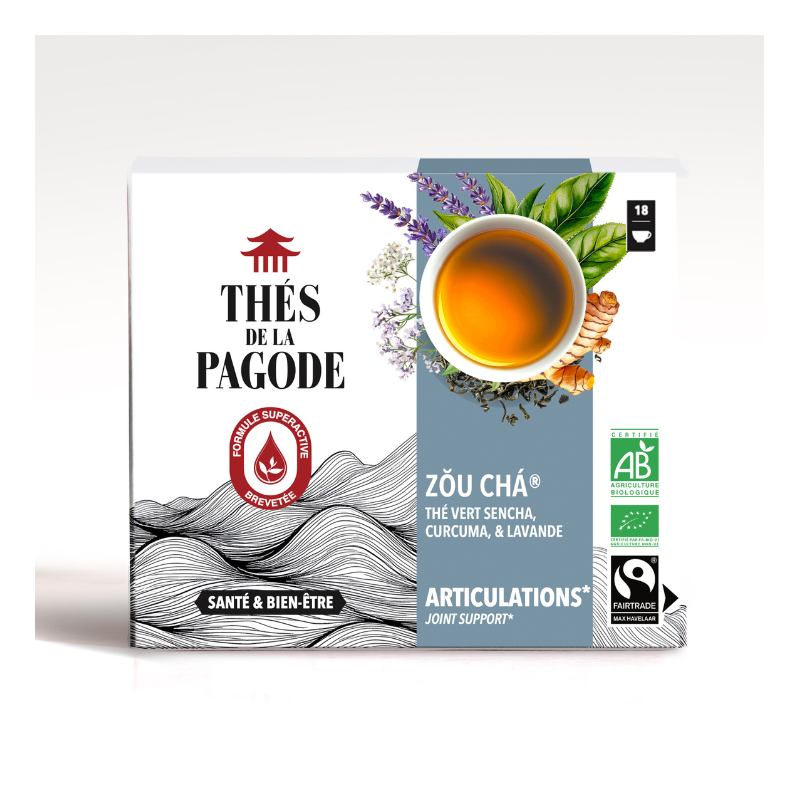Zou Chá tea, literally translated as “tea for joints” in Chinese, is a Sencha green tea with turmeric and meadowsweet. This blend is meticulously prepared using Thés de la Pagode’s extensive experience and expertise, resulting in a preparation containing a higher concentration of selected active ingredients in the form of dry extracts, for optimal effectiveness.