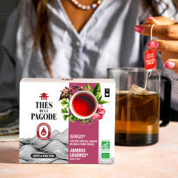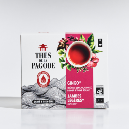 Gingo® tea contains an effective blend of Chinese green tea, red vine, elder, ginkgo biloba, hibiscus, lemongrass and verbena. This smart blend helps improve blood circulation.
