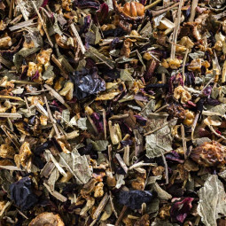 Morceau de pomme bio, feuilles de cassis bio, cynorrhodon bio, morceaux de framboise bio, marc de raisin bio, hibiscus bio, réglisse bio