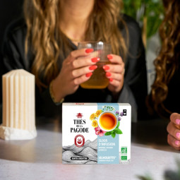 Quant à la Menthe, elle offre des notes fraîches et désaltérantes à cette infusion 100% bio sans théine. Grâce à elle, Taille de Geisha® se déguste aussi bien chaude que glacée, et sera votre compagne idéale tout au long de la journée pour vous aider à retrouver la ligne.