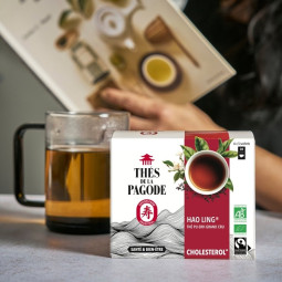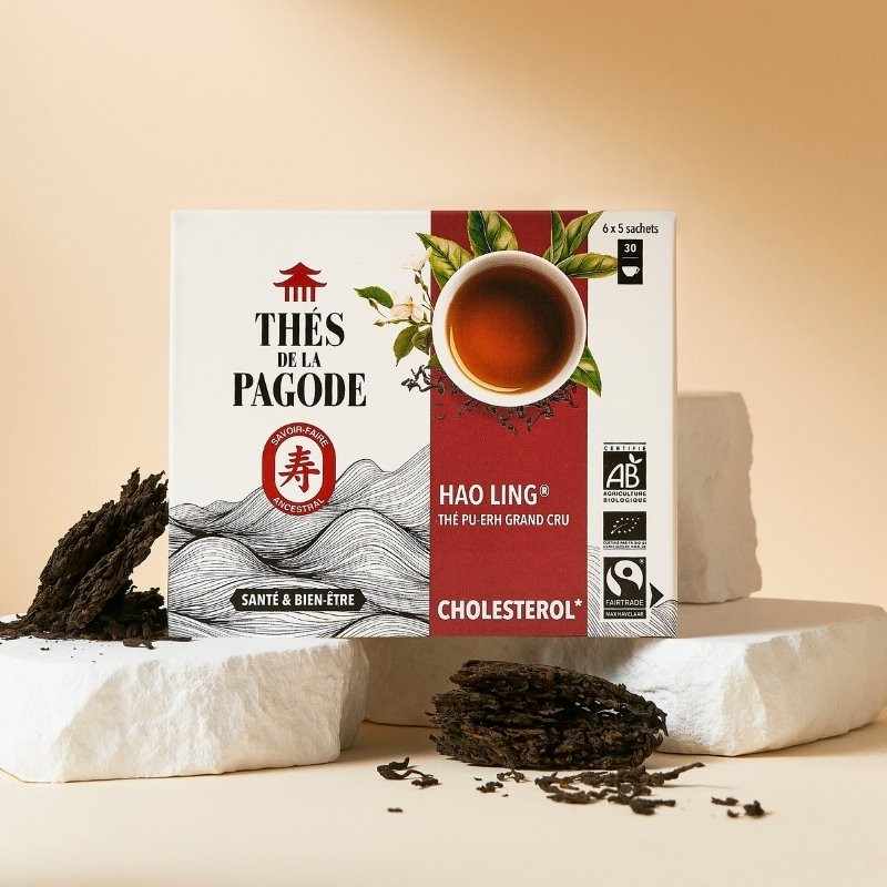 Grâce à son assemblage de 3 thés grands crus biologiques (thé pu-erh, thé wulong et thé vert), Hao Ling ® est un thé riche en théaflavines et théarubigines qui contribuent au maintien d’un taux de bon cholestérol (HDL) ayant une action protectrice sur les artères en éliminant les plaques d’athérome.