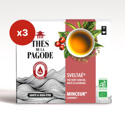Sveltaé un thé vert Grand Cru au maté et au guarana, certifiés agriculture biologique. Le thé est recommandé pour accompagner une cure minceur, en complément d’un régime alimentaire varié et équilibré. Ce thé de Chine dispose de propriétés amincissantes et aide à combattre les excès de poids dans le cadre d'un régime amincissant. L’association thé vert, maté et guarana permet une efficacité maximale grâce à la synergie de ses actifs. Avec ses notes de citron, de bergamote et de menthe, ce thé vert délicatement parfumé se déguste avec plaisir.